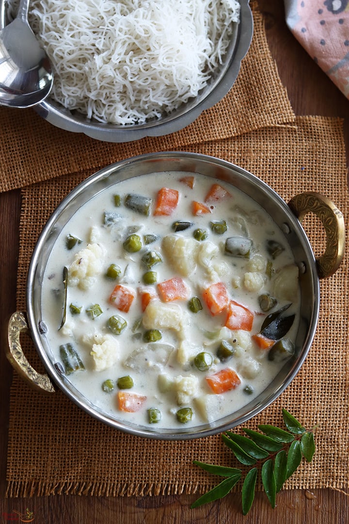 Vegetable Stew is a Kerala special side dish for idiyappam, aapam made with a combination of vegetables simmered in coconut milk sauce. It is a popular stew from Kerala cuisine as the taste is mild and not spicy, so even kids will love it. Recipe included with step by step pictures and video.